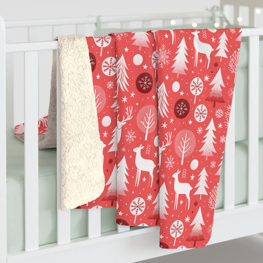 Warm Winter Sherpa Fleece Blanket, Red Throw Blanket, Deer, Trees, Snowflakes Winter Blanket