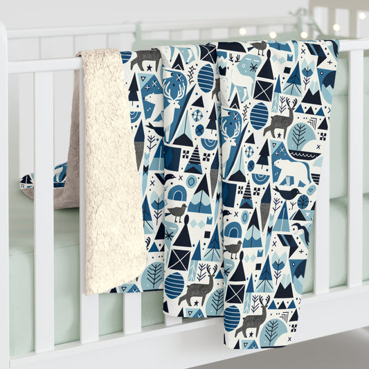 Frozen Forrest Sherpa Fleece Blanket, Abstract Blue Blanket with Bears, Deers, Birds, Trees