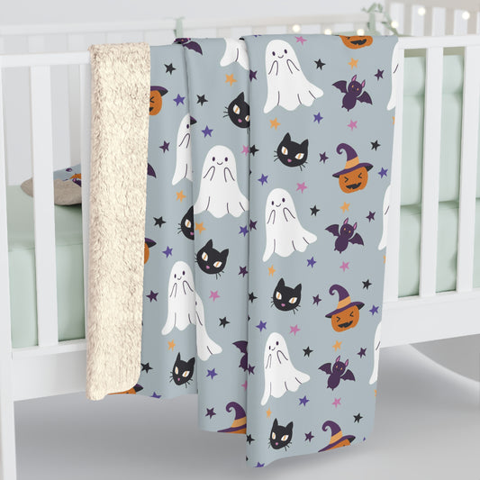 Halloween Sherpa Blanket, Ghoul Gang Ghost Black Cat Witch Hat Fleece Blanket Gray