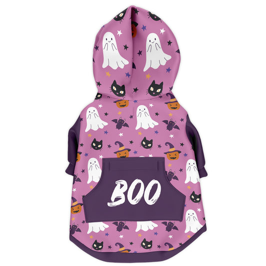 Cute Halloween Pink Dog Hoodie, Spooky Ghosts, Black Cats, Pumpkins & Bats