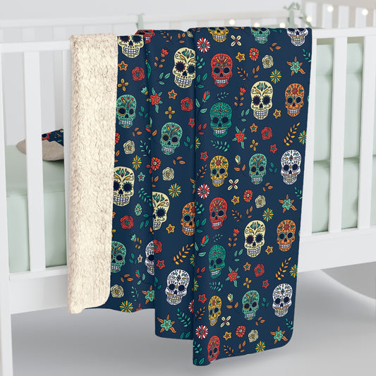 Sugar Skull Sherpa Blanket, Day of the Dead Halloween Blanket, Blue Throw Blanket, Cozy Sofa Blanket