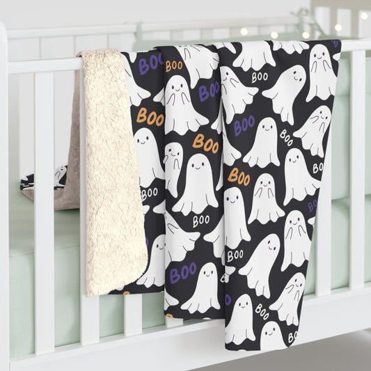 BOO Ghost Sherpa Blanket, Halloween Ghostly Throw Blanket, Black Fleece Blanket, Cozy Sofa Blanket