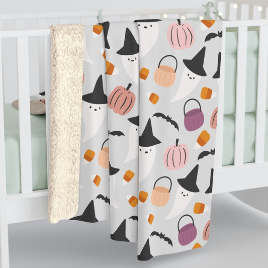 Halloween Whimsical Sherpa Blanket, Ghost Pumpkin Bats Throw Blanket Gray