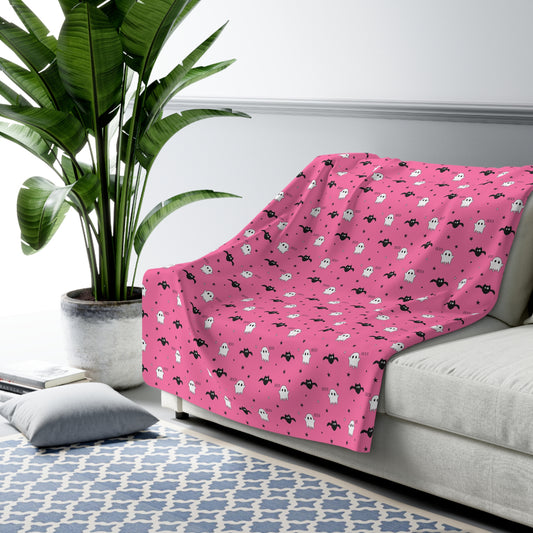 BOO Ghosts & Bats Sherpa Fleece Blanket, Halloween Throw Blanket Pink