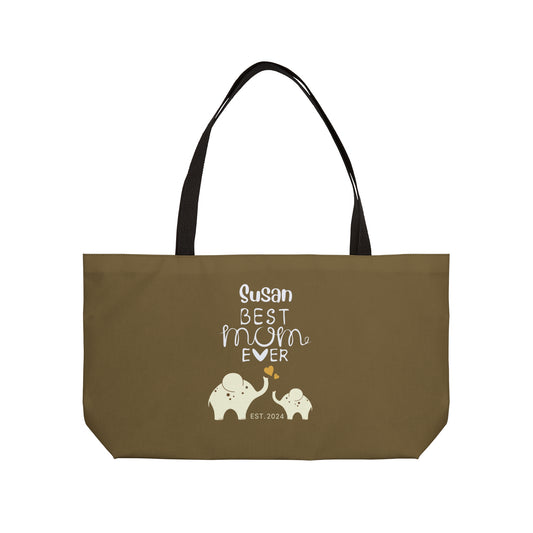 Personalized Best Mom Ever Weekender Bag for Mom, Khaki Baby Elephants Tote Bag