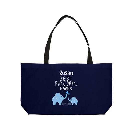 Personalized Best Mom Ever Weekender Bag for Mom, Blue Baby Elephants Tote Bag